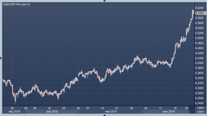 Возникла реальная угроза повторения событий августа 2015 года. Все больше на правду начинает походить предположение, что Китай проведет девальвацию юаня, чтобы компенсировать влияние торговых тарифов со стороны Соединенных Штатов. Отток капитала, наблюдавшийся ране, в Турции и Бразилии, докатился до Азии. Во вторник китайский юань продолжает падать. Доллар пробил вверх уровень 6.6 юаня за доллар — впервые с декабря 2017, причем как на континенте, так и на оффшорных рынках.