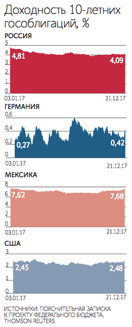 Для желающих вернуть капитал в Россию Минфин выпустит обычные еврооблигации до $3 млрд, сказал в четверг министр финансов Антон Силуанов, программа внешних займов увеличена не будет, цитирует его слова Reuters. Бюджет предусматривает, что в 2018 г. Россия может разместить их на сумму до $3 млрд и еще может быть выпуск до $4 млрд для обмена уже обращающихся бумаг.