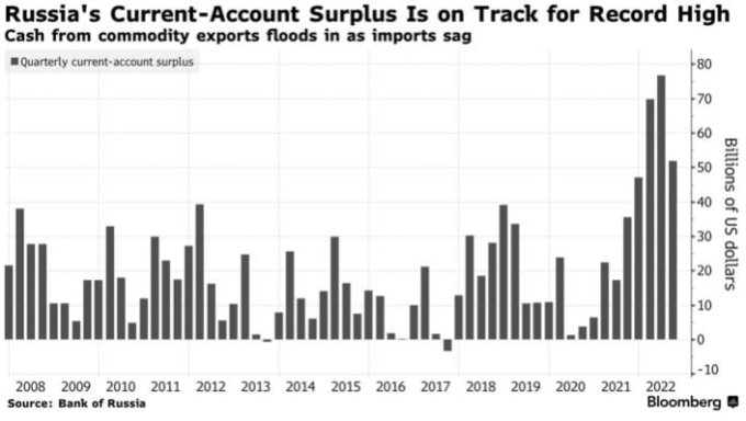 Огромные суммы растекаются по финансовой системе России в результате рекордного положительного сальдо счета текущих операций, который центральный банк прогнозирует на уровне 243 миллиардов долларов в этом году, или почти вдвое больше, чем в 2021 году.