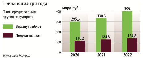 При этом РФ вернет себе в 2020–2022 годах от выданных ранее кредитов значительно меньше — 370 млрд рублей ($5,4 млрд).