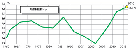 Сколько в стране в разные годы доживало до 65 лет женщин, в %. Источник: Всемирный банк