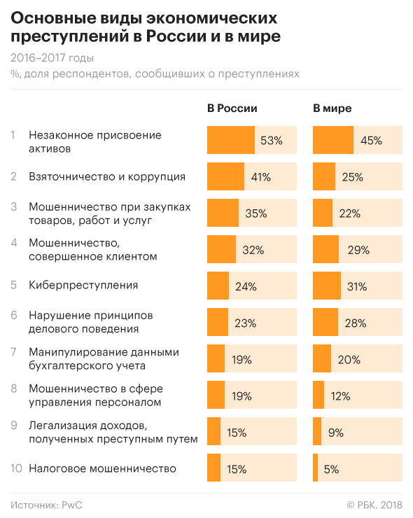 Как в России, так и во всем мире самый распространенный вид экономического преступления — незаконное присвоение активов, но в России этот вид мошенничества отметили 53% респондентов, а в мире — 45%. На втором месте в России — взяточничество и коррупция (41% по сравнению с 30% в 2016 году). При этом во всем мире с коррупцией компании сталкиваются гораздо реже — 25%.