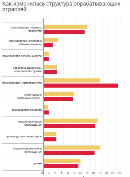 Рост же доли добычи полезных ископаемых может быть связан с тем, что добывающие отрасли, которые преимущественно ориентированы на экспорт, не так сильно пострадали от кризиса 2014 г., как остальные секторы экономики, считает Долгин. Но доля добывающих отраслей может быть завышена, предупреждает Евдокимова: в 2018 г. высокие цены на нефть сочетались со слабым курсом рубля из-за санкционных рисков, поэтому рублевая цена нефти, а с ней и добавленная стоимость добывающих предприятий росли. Рост доли нефтепереработки также стоит оценивать осторожно, предупреждает Сальников, это часть работы вертикально-интегрированных компаний, а не отдельная отрасль: сырье у большинства заводов покупается внутри компаний и структура добавленной стоимости зависит в том числе от внутренней цены на это сырье.