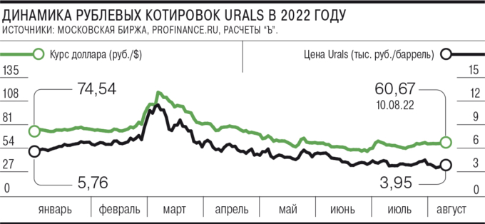 В августе рублевая стоимость российской нефти Urals вернулась на уровень ниже 4 тыс. руб. за баррель. По данным Profinance.ru, в конце прошлой недели стоимость нефти опускалась до 3,65 тыс. руб. за баррель, минимума этого года. Даже с учетом коррекции в среду, 10 августа, она оставалась возле 3,9 тыс. руб. за баррель, на 17% ниже значений конца июля.
