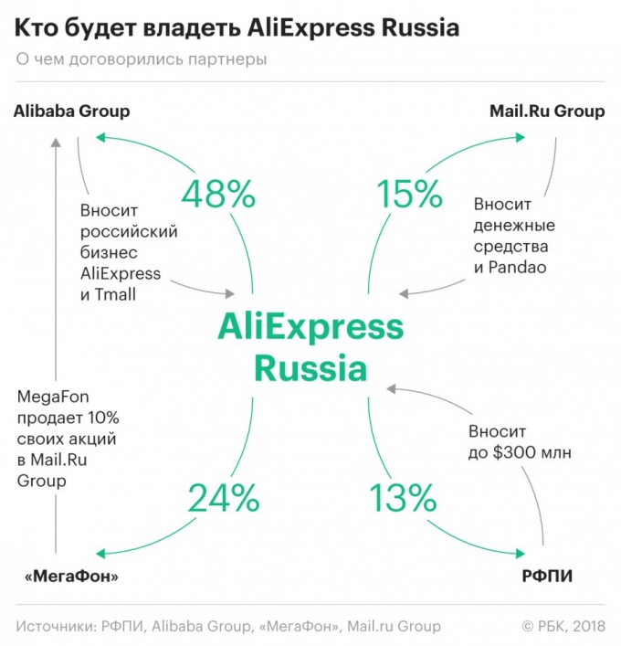 • Китайская Alibaba Group, Mail.Ru Group, «МегаФон» и Российский фонд прямых инвестиций договорились о создании совместного предприятия — AliExpress Russia. Основным владельцем с 48% станет Alibaba, получив еще и 10% Mail.Ru Group. Таким образом AliExpress Russia получит доступ к 100-миллионной аудитории Mail.Ru Group в соцсетях, мессенджерах, онлайн-играх, электронной почте.