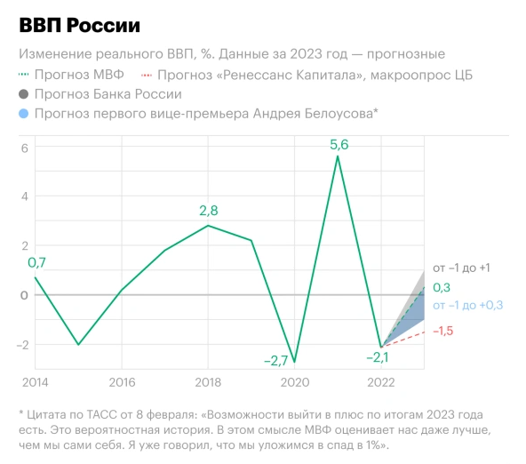 ЦБ теперь допускает, что в 2023 году российская экономика может вырасти: его прогнозный диапазон на текущий год — от минус 1% до плюс 1% (ранее он прогнозировал спад экономики в пределах 1–4%). Прогноз роста российского ВВП дает и МВФ (+0,3%).
