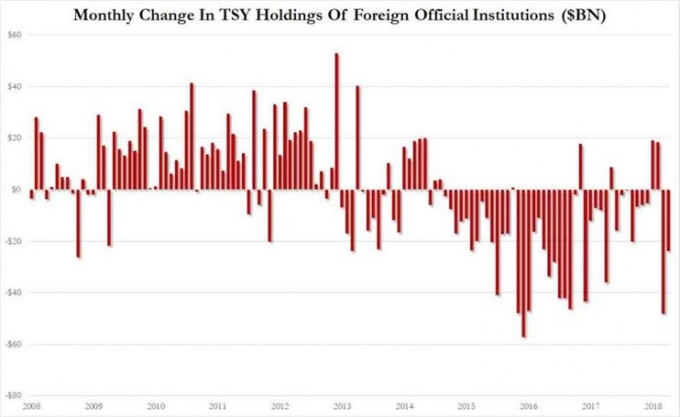 Еще в апреле, когда «торговые войны» только начались, «Вести. Экономика» сообщали, что большинство мировых ЦБ и других официальных институтов начали агрессивно избавляться от американского госдолга. Возможно, это было связано именно с политикой протекционизма Трампа, возможно, с падением стоимости трежерис.