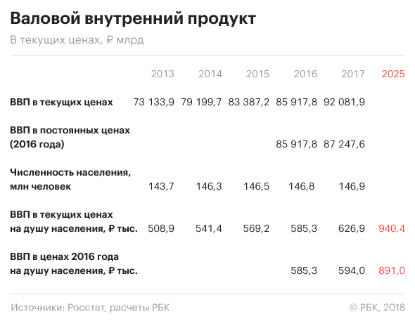 Среди других количественных целей, которые назвал Путин, — увеличение ВВП на душу населения в полтора раза к 2025 году. Источников для этого пока не видно, полагает Овчарова. «ВВП на душу населения России сильно меньше, чем в развитых странах. Если мы будем повышать уровень производительности к их уровню, то мы должны расти быстрее, чем они», — сказал РБК директор Научно-исследовательского финансового института Минфина Владимир Назаров. Заявленное президентом увеличение ВВП потребует ежегодного роста экономики на уровне 5% в год, говорит Назаров. По его словам, без принятия мер по улучшению инвестклимата такое ускорение будет вряд ли возможно.