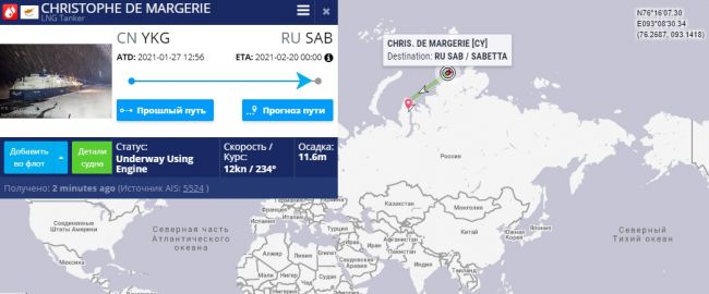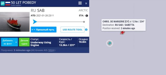 По данным навигационного портала Marinetraffic, ледокол «50 лет Победы» и танкер СПГ «Кристоф де Маржери» находятся в пятистах милях от порта Сабетта на Ямале. Туда суда планируют прийти 19 февраля. По Севморпути они уже преодолели за 11 дней более 1 700 миль.