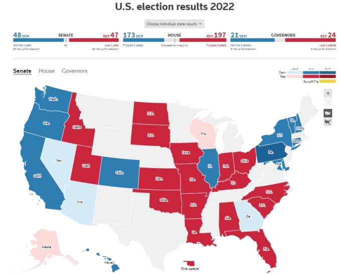 Предварительные результаты промежуточных выборов в США показали победу республиканцев, хотя перспективы общенациональной «красной волны», похоже, потускнели. Некоторые аналитики рассматривают возможность формирования разделенного Конгресса как небольшой негатив для доллара, если он ограничит бюджетные расходы.