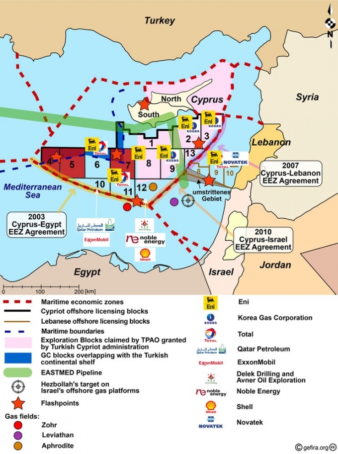 В непосредственной близости от оспариваемых вод разведка проводится итальянской Eni, French Total и American ExxonMobil. Когда в феврале турецкий военно-морской флот остановил исследовательское судно Eni в ИЭЗ Кипра, Рим решил отправить фрегат. Нарушение интересов любой из этих компаний заставит другие государства выступить с военным участием, что повлечет за собой конфликт в глобальном масштабе.