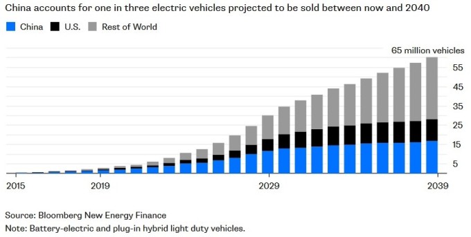 В сегодняшнем прогнозе Bloomberg особенно подчеркивает роль Китая в распространении электрического транспорта. Один из трех электромобилей, которые будут реализованы в мире с сегодняшнего для по 2040 год, будет продан в Китае.
