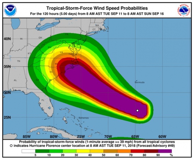 По прогнозам Национального центра США по предупреждению об ураганах, «Флоренс» будет очень опасным крупным ураганом» вплоть до контакта с атлантическим побережьем США, ожидающегося в пятницу. В ведомстве предупредили об «угрожающих жизни штормовых волнах на побережье Северной и Южной Каролины», а также вероятных наводнениях прибрежных районов.