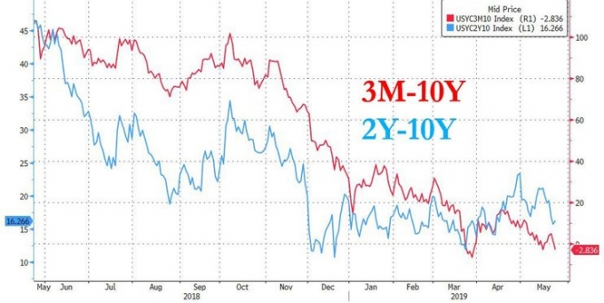 Кривая доходностей на отрезке 3-10-летних бумаг снова приняла инверсионный вид, что сигнализирует о грядущей рецессии. Разница ставок на отрезке 2-10-летних бумаг, на который чаще смотрят аналитики, сократилась на 16 пунктов и также приближается к инверсии.