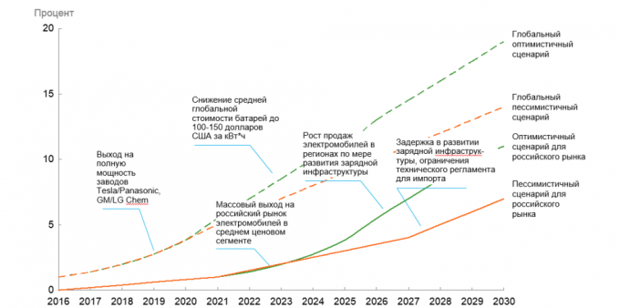 Что касается федерального правительства, то все планируемые стимулы для электромобилей изложены в проекте «Стратегия развития автомобильной промышленности Российской Федерации на период до 2025 года», подготовленном Минпромторгом России, там же описаны и сценарии развития электромобильных технологий в России. Представленные в данном документе сценарии предполагают отставание России от глобальных темпов роста доли электромобилей от 4 до 7 лет, при этом, судя по нынешней динамике, даже заложенные в пессимистичный сценарий объемы продаж в размере 85 000-100 000 электромобилей в год (4-5% от рынка) к 2025 году выглядят чрезмерно оптимистичными.