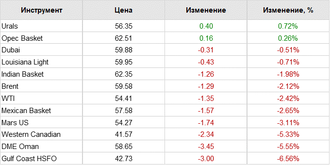 Цены на нефть растут в начале торгового дня во вторник утром после резкого снижения накануне. По данным торгов, к 05.00 по московскому времени “черное золото” обоих бенчмарков растет в цене на 0,76%. Североморская нефть Brent подорожала до 59,7 долларов за баррель, западнотехасская WTI — до 54,48 долларов.В ходе торгов в первый рабочий день новой недели Brent подешевел с 61,3 доллара до 59,3 долларов за бочку.