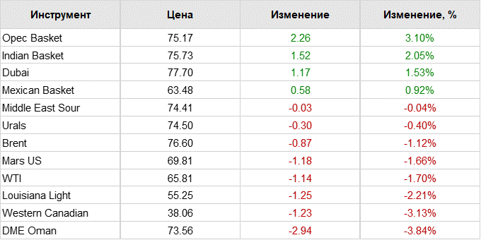 По данным на 8:08 мск августовские фьючерсы на нефть марки Brent подешевели на лондонской бирже ICE Futures на $0,33 до $76,46 за баррель. Котировки фьючерсов на нефть WTI на июль утром в понедельник уменьшились на $0,10 до $65,71 за баррель.