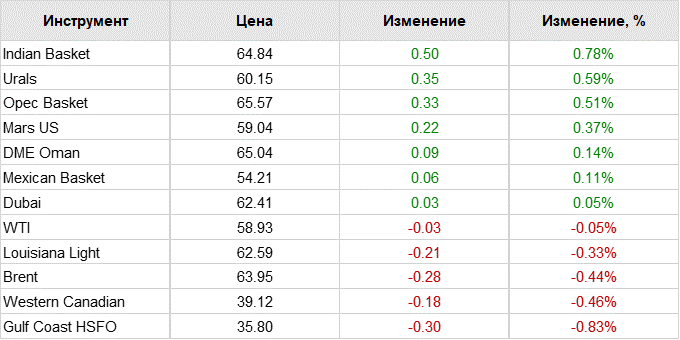 По данным с торговых площадок, к шести утра по московскому времени стоимость барреля североморской нефти Brent составляла 63,89 доллара, на 0,7% ниже закрытия предыдущей сессии. Бока западнотехасской нефти WTI подешевела к этому времени на полпроцента, до 58,92 долларов.