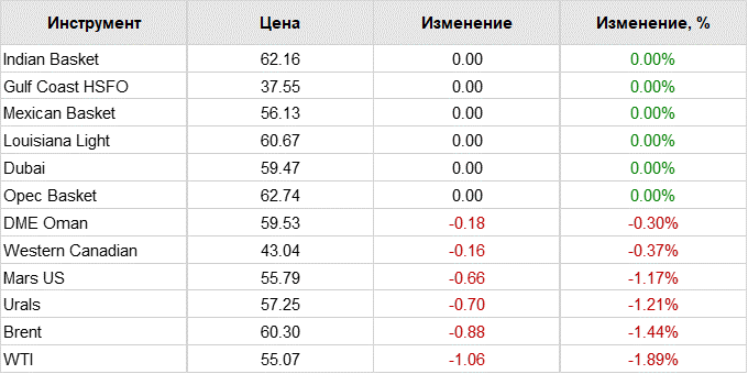 В начале последнего торгового дня уходящей недели котировки “черного золота” снижаются на мировых рынках. Нефть Brent теряет в цене 0,30%, до 60,2 долларов за баррель. Нефть WTI дешевеет на 0,27%, до 54,94 долларов за бочку, свидетельствуют данные торгов на 05.25 по московскому времени.