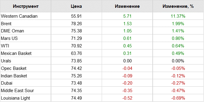 По данным на 7:46 мск июльские фьючерсы на североморскую нефтяную смесь сорта Brent подорожали на 0,09% до $78,3 за баррель, июньские фьючерсы на нефть марки WTI — на 0,06% до $71 за баррель.