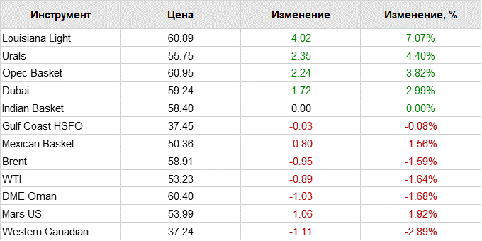 Во вторник утром после некоторой коррекции накануне снижение котировок продолжилось. По данным торгов, к 05.15 по московскому времени стоимость барреля североморской нефти составляла 59,09 (снижение 0,44%), WTI — 53,33 (-0,49%).