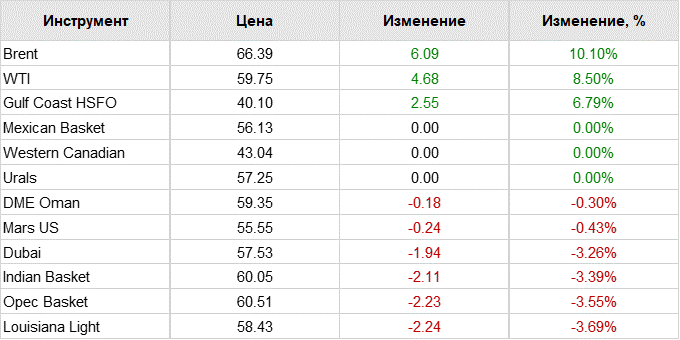 Цена октябрьского фьючерса на нефть марки WTI увеличилась на 11,23%, до $61,79 за баррель (против почти $55 на момент предыдущего закрытия). Впоследствии цены на фьючерсы на Brent скорректировались до $66,64 (+10,5%; данные на 09:05 мск), а WTI — до $59,89 (+9%).