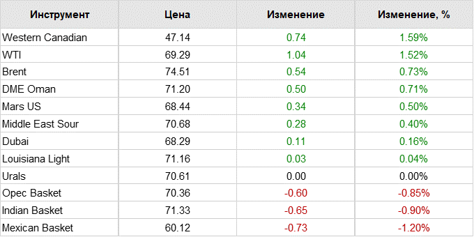 По состоянию на 8:12 мск июньские фьючерсы на нефть сорта Brent подорожали на лондонской бирже ICE Futures на $0,16 до $74,87 за баррель. Нефть WTI с поставкой в июне на электронных торгах Нью-Йоркской товарной биржи (NYMEX) поднялась в цене на $0,26 до $68,90 за баррель, сообщает «Интерфакс».