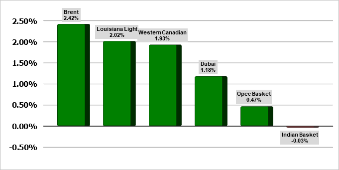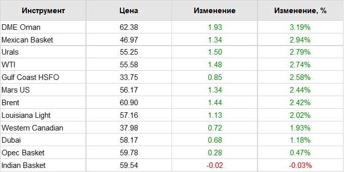 Цены на нефть обеих марок растут в среду вечером более чем на 1% на фоне статданных по запасам США за неделю, свидетельствуют данные торгов. По состоянию на 19.10 мск цена декабрьских фьючерсов на североморскую нефтяную смесь марки Brent росла на 1,02%, до 60,31 доллара за баррель, стоимость декабрьских фьючерсов на нефть марки WTI — на 1,3%, до 55,19 доллара за баррель.
