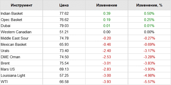 По состоянию на 8:05 мск июльские фьючерсы на нефть сорта Brent подешевели на лондонской бирже ICE Futures на $1,35 до $75,09 за баррель. Нефть WTI с поставкой в июле на электронных торгах Нью-Йоркской товарной биржи (NYMEX) упала в цене на $1,66 до $66,22 за баррель.