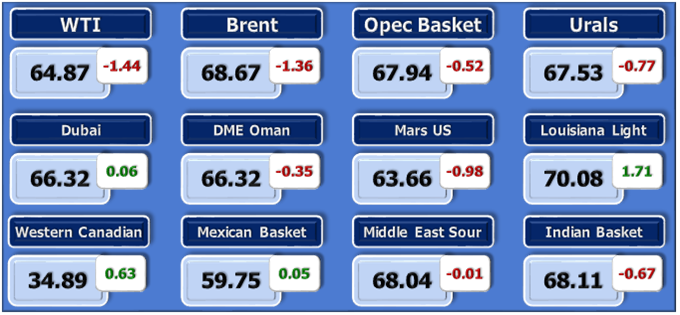 На Нью-Йоркской товарной бирже фьючерсы на нефть WTI с поставкой в марте торгуются по цене 65,45 долл. за баррель, на момент написания данного комментария опустившись на 1,04%.