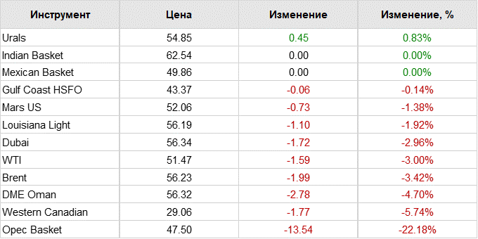 По данным торгов, к 05.50 по московскому времени цены на нефть североморского сорта Brent снижались на процент, до 56,09 долларов за баррель. Бочка западнотехасской нефти WTI подешевела к этому времени на 0,6%, до 51,27 доллара.