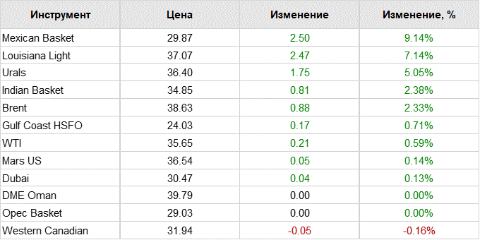 По состоянию на 7.49 мск цена августовских фьючерсов на североморскую нефтяную смесь марки Brent росла на 0,86% — до 38,65 доллара за баррель. Июльские фьючерсы на нефть марки WTI дорожали на 0,56% — до 35,64 доллара за баррель.