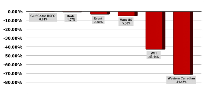 Мировые цены на нефть в понедельник утром снижаются, в то время как инвесторы продолжают отыгрывать прогноз Международного энергетического агентства (МЭА) о рекордном падении глобального спроса на неё, при этом американская марка WTI дешевеет более чем на 5% на сведениях о переполнении мощностей для хранения сырья в США, свидетельствуют данные торговых площадок.