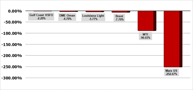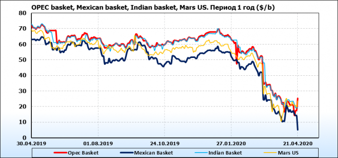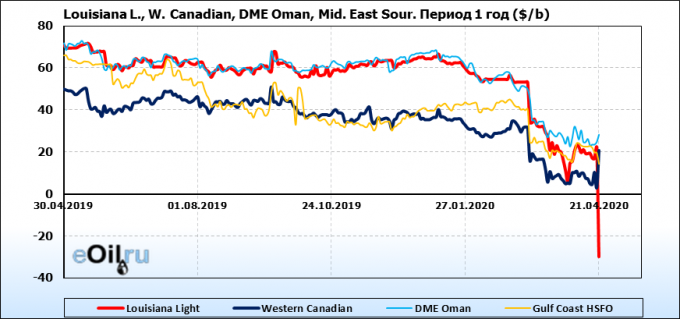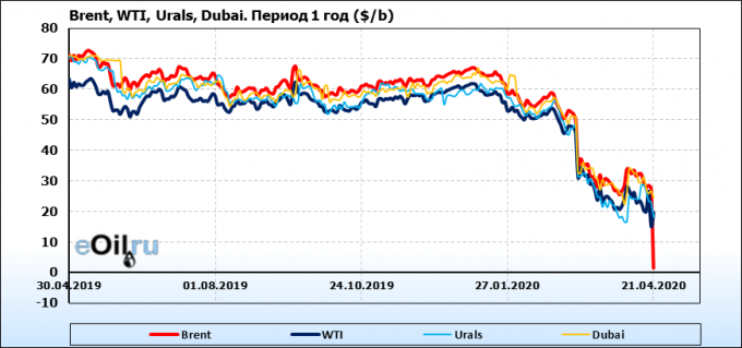 Стоимость майского фьючерса на нефть WTI в понедельник впервые в истории США опустилась на Нью-Йоркской товарной бирже до отрицательных показателей. К 16:36 по времени Восточного побережья США (23:36 мск) цена поставок энергоносителя в мае снизилась на $35,97 (196,88%), до минус $17,7. Стоимость поставок в июне подешевела примерно до $20 за баррель.
