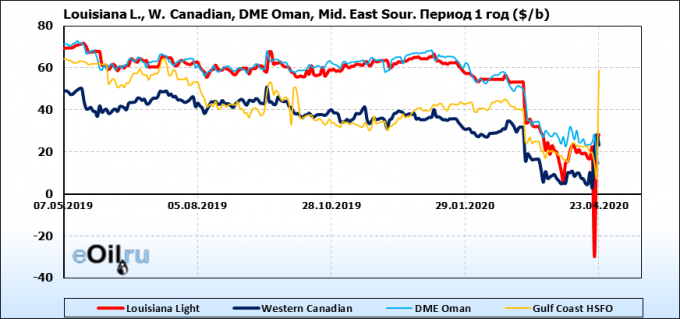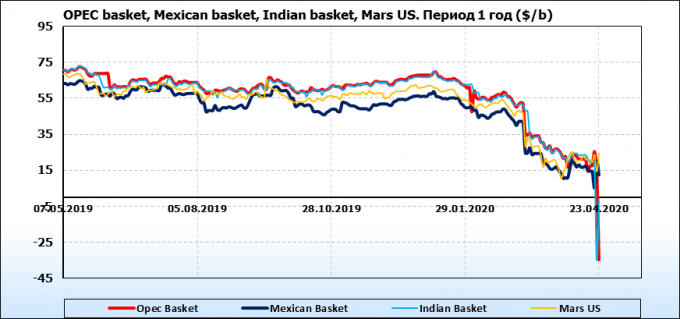В понедельник цена сырья WTI с поставкой в мае впервые в истории упала до отрицательных значений, котировки на NYMEX достигали минус 40,32 доллара за баррель. На следующий день стоимость июньских фьючерсов рухнула на 43,4%, до 11,57 доллара за баррель (в ходе торгов опускалась до 6,55 доллара).