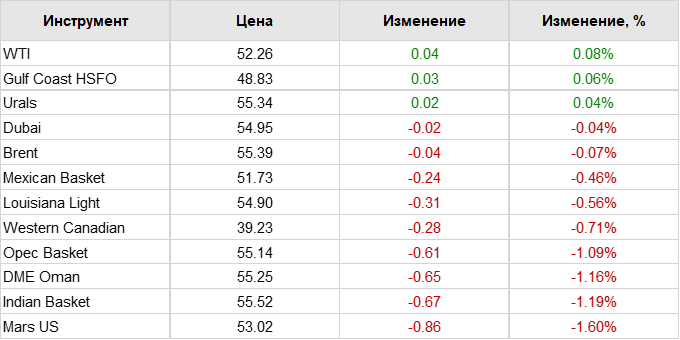 По состоянию на 7.46 мск цена апрельских фьючерсов на североморскую нефтяную смесь марки Brent опускалась на 0,14%, до 55,17 доллара за баррель, мартовских — на 0,13%, до 55,34 доллара. Стоимость мартовских фьючерсов на WTI снижалась на 0,08%, до 52,23 доллара за баррель.