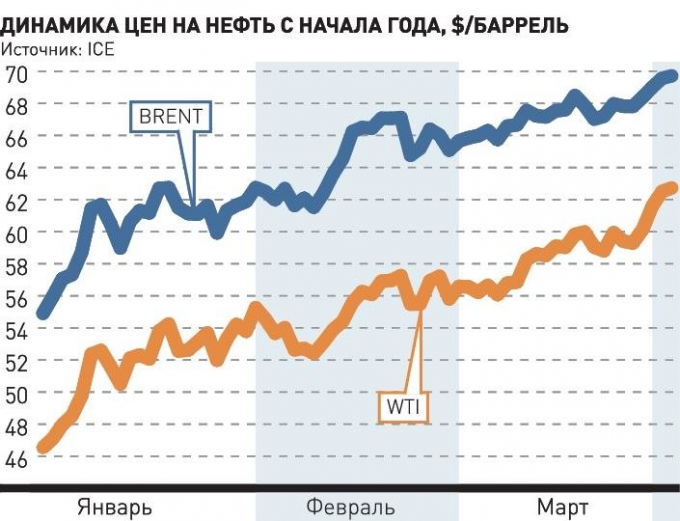 Стоимость барреля нефти североморской смеси Brent на этой неделе вплотную подошла к 70 долларам, барреля американского сорта WTI — к 63. Это уровни ноября прошлого года. Катализатором роста стали опасения инвесторов о грядущем дефиците предложения на мировом рынке, а геополитика только ускоряет этот процесс. Не исключено, что реальный дефицит наступит уже летом, и цена Brent закрепится выше 70 долларов.
