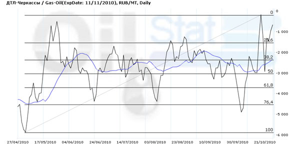 По сообщению компании «Алгоритм», в счёт экспортных отгрузок на Володарской ЛПДС провели замещение дизельного топлива Л-0,2-62 трейдеры в количестве несколько тысяч тонн. Это несколько снизило остроту дефицита. Цены предлагались трейдерами от 19800 руб. за тонну до 20300 руб. за тонну. Капотня перестала отпускать зимнее топливо сорта Е. По мнению сообщества, Московский НПЗ в оставшиеся дни октября будет нарабатывать дизельное топливо под прокачку на Володарку и с первого ноября товар будет распределён по клиентам. Но цены подрастут в очередной раз. Ожидаем завтра обновление прайса от «Газпром нефть-центр» (МАГМА).