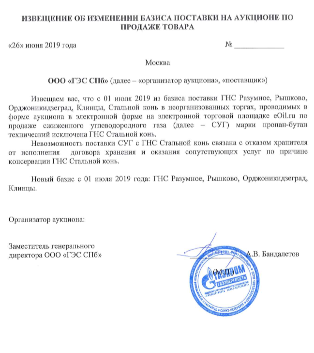 С 1 июля 2019 базис поставки ГНС Разумное, Рышково, Орджоникидзеград, Клинцы, Стальной конь в неорганизованных торгах, проводимых в форме аукциона в электронной форме на электронной торговой площадке eOil.ru по продаже сжиженного углеводородного газа (далее – СУГ) марки пропан-бутан технический (далее – ПБТ) будет изменен. Новый базис: ГНС Разумное, Рышково, Орджоникидзеград, Клинцы. Таким образом, базис Стальной конь исключается из торгов.