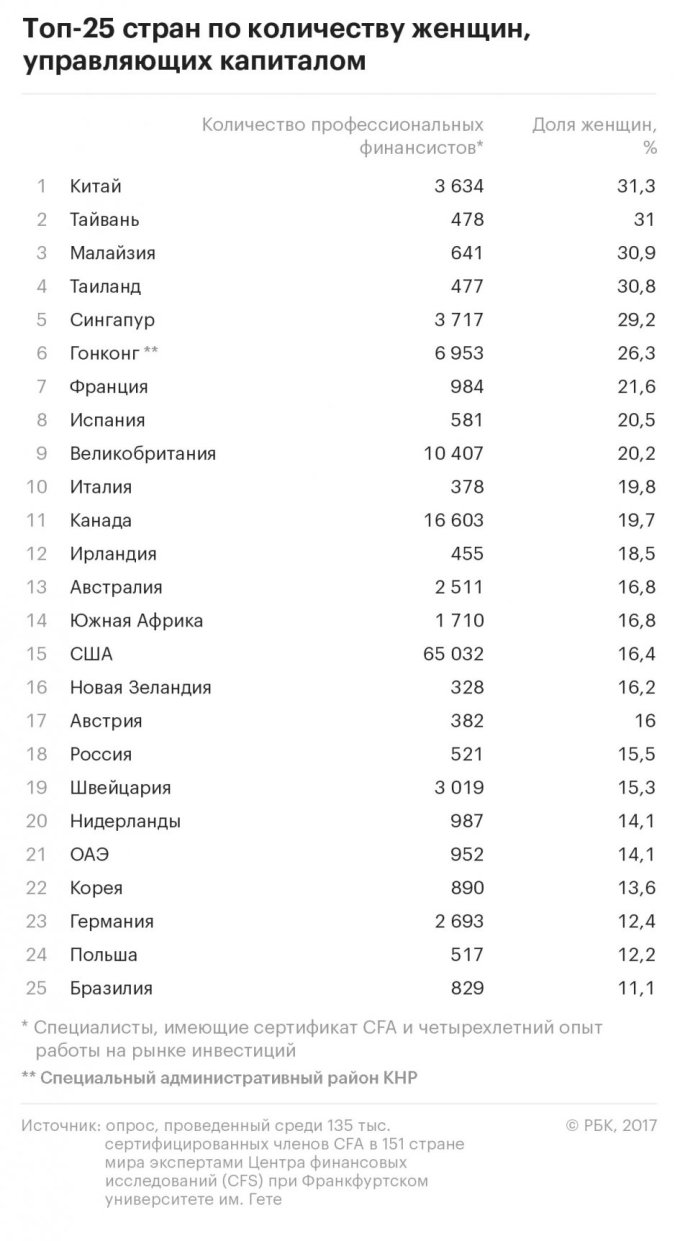 В число стран с заметной долей женщин среди портфельных управляющих также входят Франция, Испания, Великобритания, Италия и Канада, в которых доля женщин-финансистов составляет примерно по 20%. Чуть ниже этот показатель в Ирландии (18,5%), Австралии, Южной Африке и США (16,4–16,8%). Россия в этом рейтинге занимает 18-е место с 15,5-процентной долей женщин среди портфельных управляющих. При этом ей удалось опередить по доле женщин-финансистов такие европейские страны, как Швейцария (15,3%) и Нидерланды (14,1%).