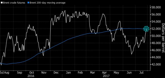 Нефть марки Brent торгуется на $2.81 больше, чем West Texas Intermediate. Цена на Brent превышает 200-дневную скользящую среднюю цену.
