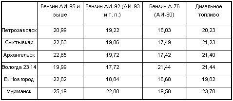 В этой связи интересно, каковы цены на моторное топливо в Петрозаводске и в Карелии. Некорректно было бы сравнивать с городами средней полосы, юга России или Сибири.