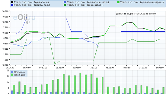 Многие участники рынка до недавнего времени спешили отгрузить объемы за границу, пока экспортная альтернатива позволяла получать достаточно прибыли с торговли на внешнем рынке. Нехватка объемов внутри страны в сочетании с достаточно высоким спросом подталкивала цены к движению вверх. Теперь же эта тенденция приостановилась в связи с падение мировых котировок в Северо-Западной Европе и на Средиземноморье, что снизило и без того низкую доходность экспорта. По состоянию на 18 февраля разница между средней ценой внутреннего рынка на дизельное топливо зимнее и экспортного эквивалента относительно Северо-Западной Европы составила 4 153 руб./т в пользу внутреннего рынка.