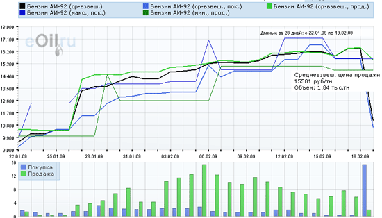 18 февраля на Торговой площадке eOil.ru стоимость бензина марки Аи-92 значительно понизилась. Так, средневзвешенная цена продажи упала на 881 руб./т. и составила 15 581 руб. за тонну, объем предложения также сократился на 3,76 тыс. тонн до отметки 1,84 тыс. тонн. Средневзвешенная цена покупки резко упала на 5 050 руб./т. и составила 10 600 руб. за тонну, объем спроса вырос на 15 ты. тонн и составил 15,3 тыс. тонн.