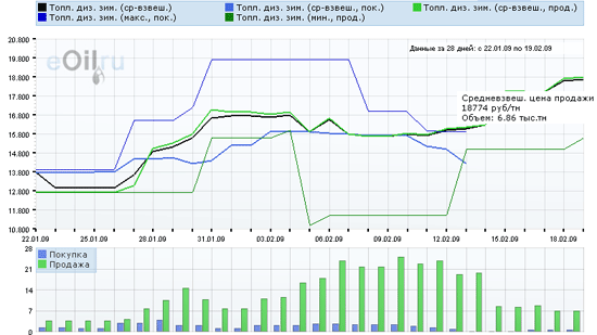 18 февраля на Торговой площадке eOil.ru стоимость дизтоплива зимнего несколько выросла. Так, стоимость продажи увеличилась на 57 руб./т. и составила 18 774 руб. за тонну, объем предложения остался на прежнем уровне 6,86 тыс. тонн. Средневзвешенная цена покупки не изменилась, как и объем спроса. Так, стоимость покупки составила 17 000 руб./т. при объеме спроса 0,48 тыс. тонн.