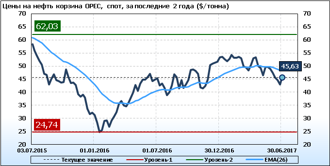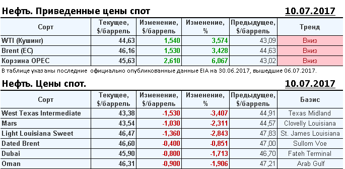 Цены на нефть сорта Brent с поставкой из портов ЕС выросли на 1,53 до 46,16 долларов за баррель. Тренд на рынке Brent падающий. Цены на корзину сортов нефти стран членов ОПЕК выросли на 2,61 до 45,63 долларов за баррель. Ценовая тенденция по корзине ОПЕК направлена вниз.