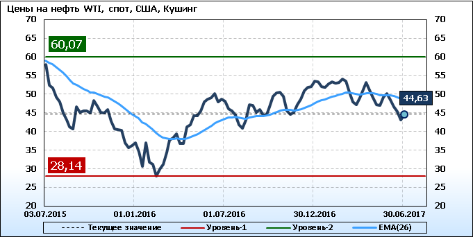 Цены на нефть сорта WTI с базиса поставки Кушинг выросли на 1,54 до 44,63 долларов за баррель. Тренд на рынке WTI медвежий.