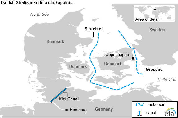 Датские проливы — серия каналов, соединяющих Балтийское море с Северным морем — являются важным маршрутом для экспорта российской нефти в Европу. По оценкам, в 2016 году через датские проливы транспортировалось 3,2 млн. б/д нефти и нефтепродуктов. В 2005 году Россия переместила значительную часть своего нефтяного экспорта в свои порты Балтии после открытия порта Приморск в Финском заливе. В 2016 году относительно небольшое количество нефти, менее 50 000 б/д, в основном из Норвегии и Соединенного Королевства, направилось на восток через датские проливы на скандинавские рынки.