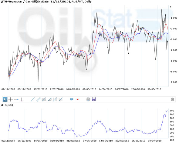 Арбитраж между ДТЛ на базисе «Черкассы» и Gas-Oil на ICE находится возле отметки -3000 руб. за тонну. ATR достиг экстремума, предупреждая о сильной волатильности цен. Это означает, что в ближайшее время тренд может начать двигаться в любом направлении. Во многом это зависит от результатов заседания ФРС США, которые станут известны уже сегодня. А также от спроса на ДТЛ на внутреннем рынке России.