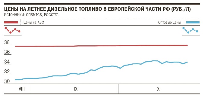 «Ценовые ножницы между оптовой и розничной ценами — типичная проблема независимых АЗС, которая всегда обостряется в предвыборный год»,— говорит собеседник “Ъ” на рынке. Рост цен на дизтопливо в октябре мог быть связан с борьбой нефтекомпаний с трейдерами, вставшими в короткую позицию по дизелю в ожидании сезонного снижения цен, полагает он: ВИНК могли сократить продажи на бирже, чтобы не позволить трейдерам закрыть сделки